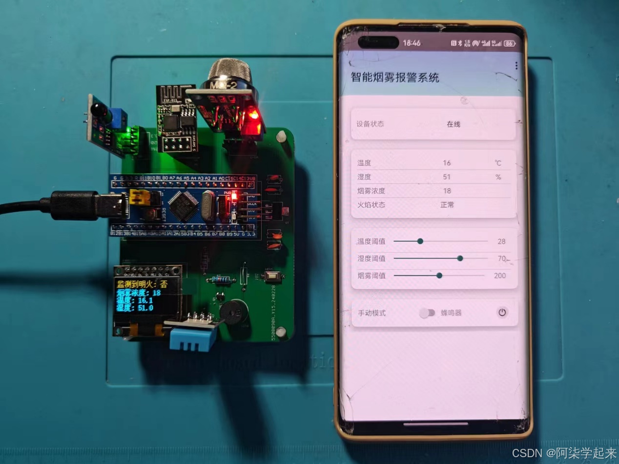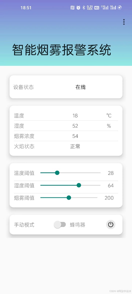 - 当烟雾浓度,温湿度超过设定阈值,LED报警灯亮和蜂鸣器响,实现声光报警