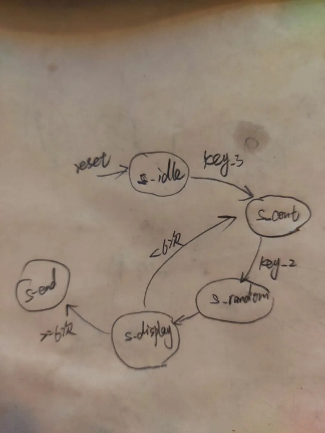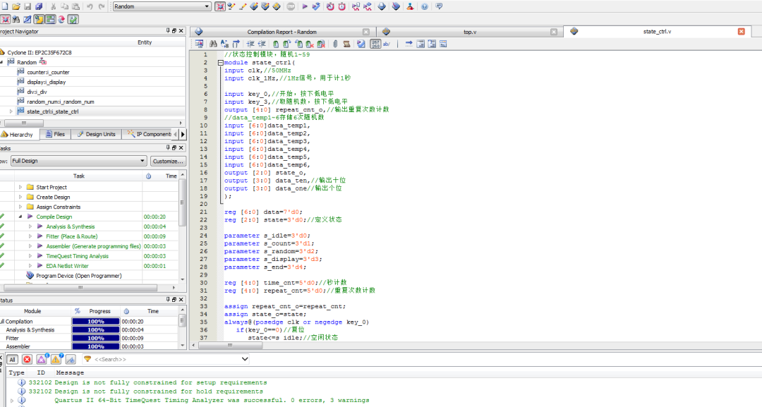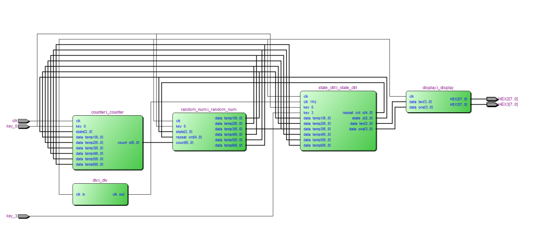 整个系统工作在5个状态:空闲(s_idle)、计数(s_count)、取随机数(s_random)、显示(s_display)和结束(s_end),通过状态控制器协调各个模块的工作。