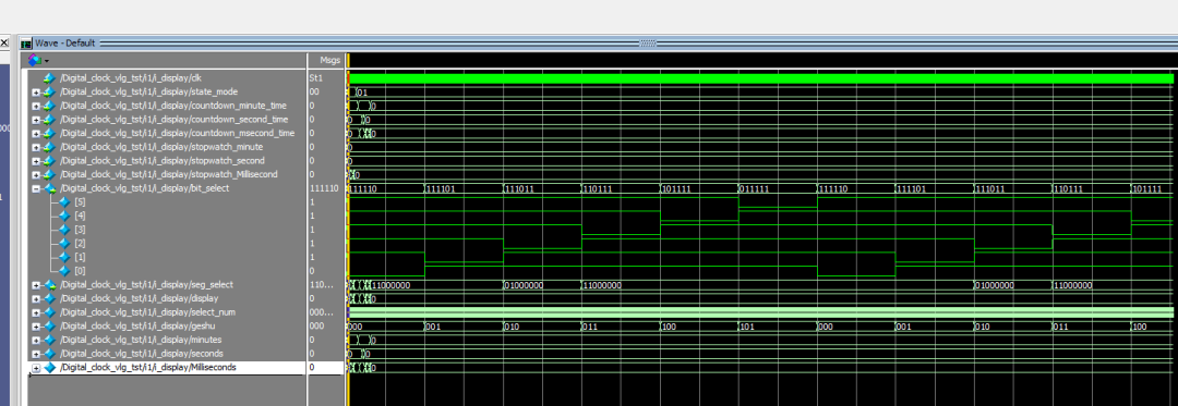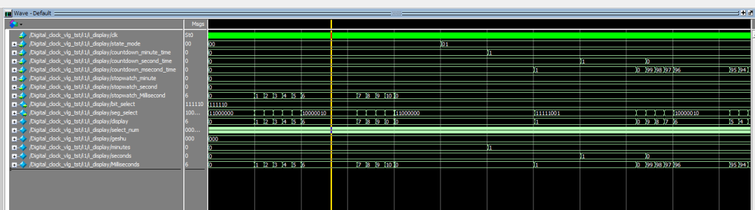 module Digital_clock( input clk_50M, input start_stop_key,//跑表启动,暂停 input reset_key,//跑表复位 input mode_key,//模式按键 input set_minute_key,//设置时间 input set_second_key,//确认 input set_msecond_key,//设置时分秒 output [1:0] led_mode,//led显示当前模式 output [5:0] bit_select,//数码管位选 output [7:0] seg_select//数码管段选 ); wire [7:0] stopwatch_Millisecond;//10毫秒 wire [7:0] stopwatch_second;//秒 wire [7:0] stopwatch_minute;//分 wire [7:0] countdown_hour_time;//时 wire [7:0] countdown_minute_time;//分 wire [7:0] countdown_second_time;//秒 wire start_stop_key_negedge; wire reset_key_negedge; wire mode_key_negedge; wire set_minute_key_negedge; wire set_second_key_negedge; wire set_msecond_key_negedge; wire [1:0] state_mode;//当前模式,4'd0:正计时,4'd1:倒计时 wire clk_100Hz; //分频模块 fenping fenping_Hz( . clk_50M(clk_50M), . clk_100Hz(clk_100Hz)//分频到100Hz );