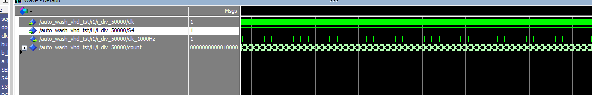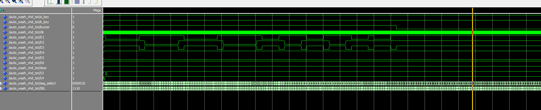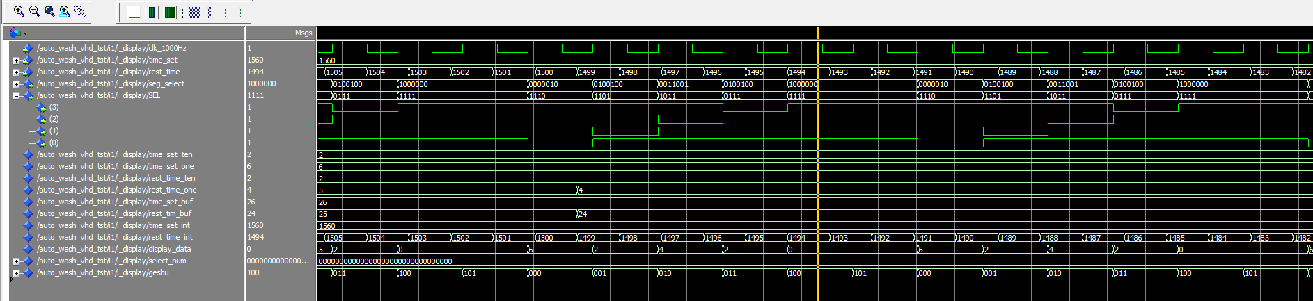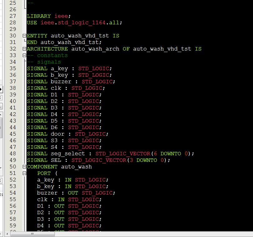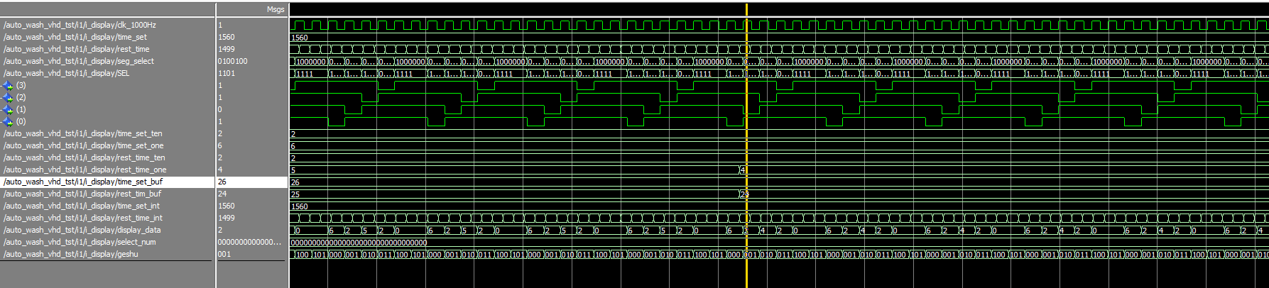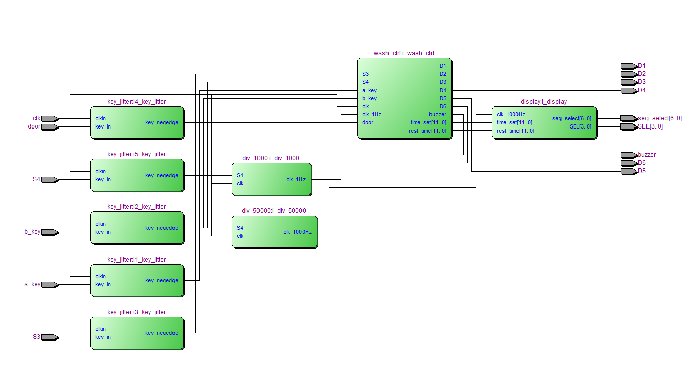 LIBRARY ieee; USE ieee.std_logic_1164.all; ENTITY auto_wash IS PORT ( clk : IN STD_LOGIC;--50MHz a_key : IN STD_LOGIC;--洗涤模式按键,按下低电平 b_key : IN STD_LOGIC;--洗涤顺序减按键,按下低电平 S3 : IN STD_LOGIC;--启动暂停按键,按下低电平 door : IN STD_LOGIC;--开关机盖按键 S4 : IN STD_LOGIC;--复位按键,按下低电平 D1 : OUT STD_LOGIC;--正转 D2 : OUT STD_LOGIC;--反转 D3 : OUT STD_LOGIC;--暂停 buzzer : OUT STD_LOGIC;--蜂鸣器 D5 : OUT STD_LOGIC;--标准洗 D4 : OUT STD_LOGIC;--加强洗 D6 : OUT STD_LOGIC;--弱洗 seg_select : OUT STD_LOGIC_VECTOR(6 DOWNTO 0);--数码管段选 SEL : OUT STD_LOGIC_VECTOR(3 DOWNTO 0)--数码管位选 ); END auto_wash; ARCHITECTURE behavioral OF auto_wash IS COMPONENT display IS PORT ( clk_1000Hz : IN STD_LOGIC; time_set : IN STD_LOGIC_VECTOR(11 DOWNTO 0); rest_time : IN STD_LOGIC_VECTOR(11 DOWNTO 0); seg_select : OUT STD_LOGIC_VECTOR(6 DOWNTO 0); SEL : OUT STD_LOGIC_VECTOR(3 DOWNTO 0) ); END COMPONENT; COMPONENT div_50000 IS PORT ( clk : IN STD_LOGIC; S4 : IN STD_LOGIC; clk_1000Hz : OUT STD_LOGIC ); END COMPONENT; COMPONENT div_1000 IS PORT ( clk : IN STD_LOGIC; S4 : IN STD_LOGIC; clk_1Hz : OUT STD_LOGIC ); END COMPONENT; COMPONENT key_jitter IS PORT ( clkin : IN STD_LOGIC; key_in : IN STD_LOGIC; key_negedge : OUT STD_LOGIC ); END COMPONENT;