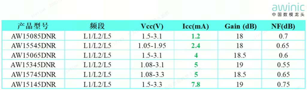 艾为电子已量产多档位功耗GNSS LNA产品系列,全面覆盖各行业差异化需求:核心型号AW15085DNR以1.2mA超低功耗达成行业领先,同时提供2.4mA、4mA等多档位多产品的选择。