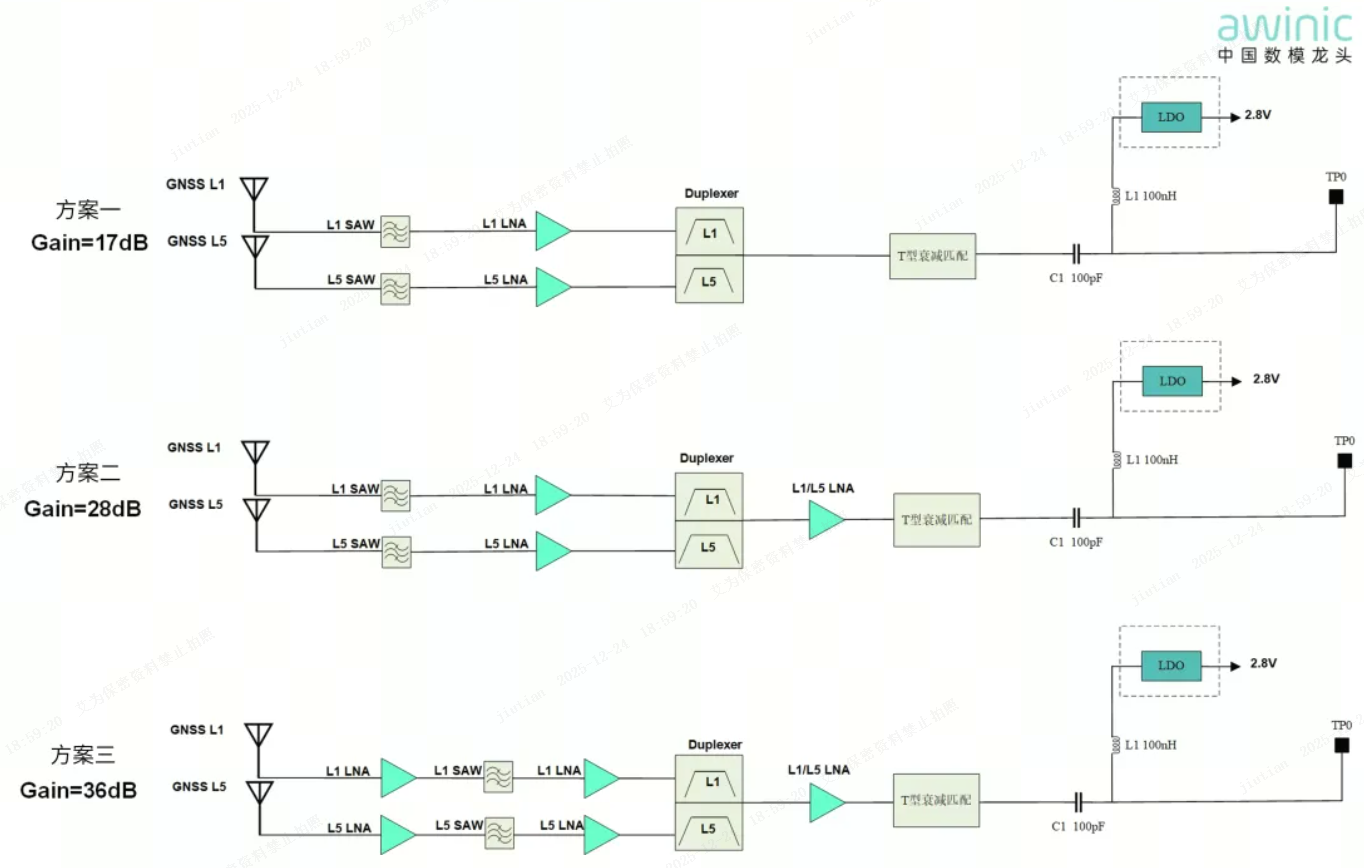 1.GNSS有源天线设计:需根据GNSS模组平台的差异确定天线增益要求,常见规格为17dB/28dB/36dB,针对不同增益需求,对应提供上述三种建议应用方案,LNA级联的前后位置可根据实际情况调整。