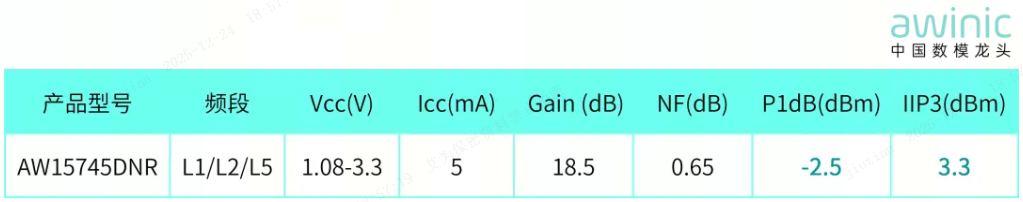 艾为电子的GNSS LNA的AW15745DNR线性度性能业内领先,P1dB达-2.5dBm,IIP3高达3.3dBm,极高的线性度有效地解决了手机蜂窝与GNSS共存场景、多模导航相互干扰问题等。