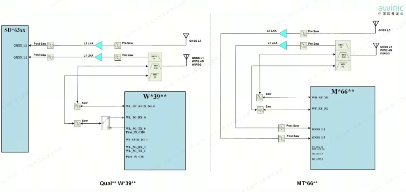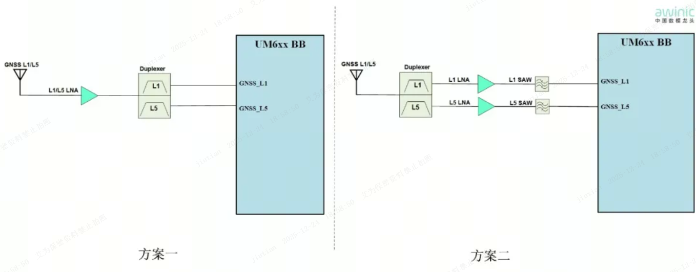 2. 天线设计方案:L1天线通常与WIFI 2.4G/5G共天线;L5天线可采用独立方案,也可与MIMO WIFI 2.4G/5G或主射频共天线,具体需根据PCB布局及天线环境确定。