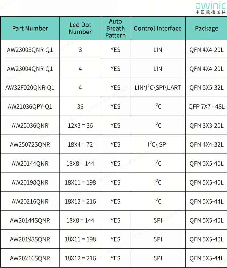 数模龙头艾为电子坐拥丰富的呼吸灯驱动芯片家族,在车载灯光领域有完整的解决方案能力,全方位覆盖多元化场景的设计诉求,为各类应用提供灵活可靠的技术支撑。