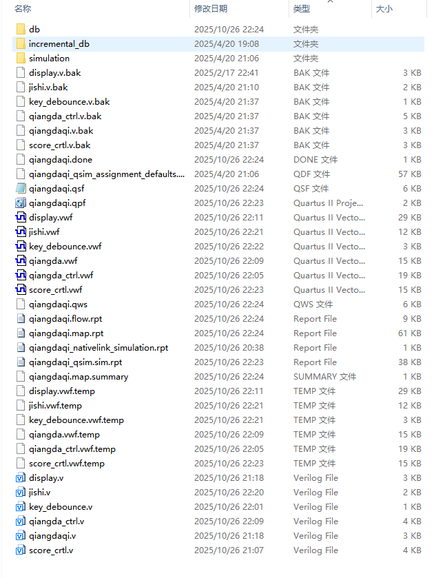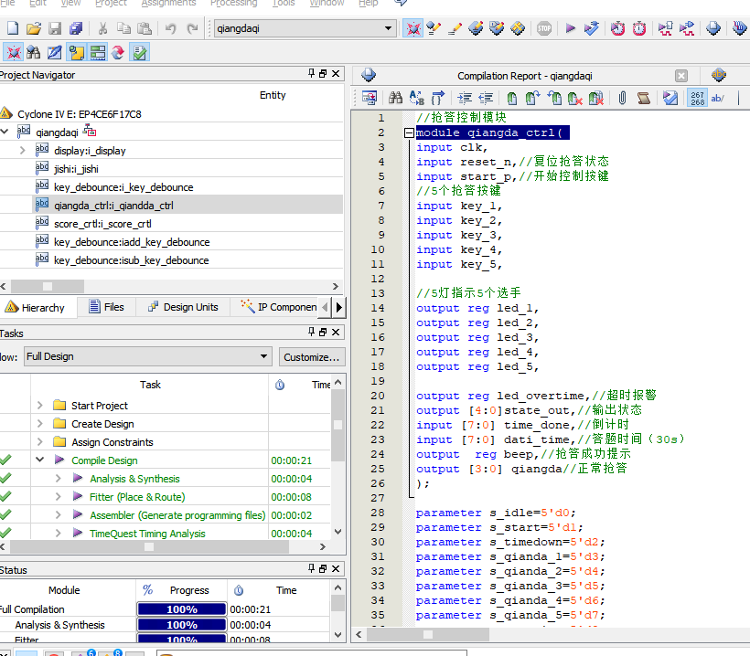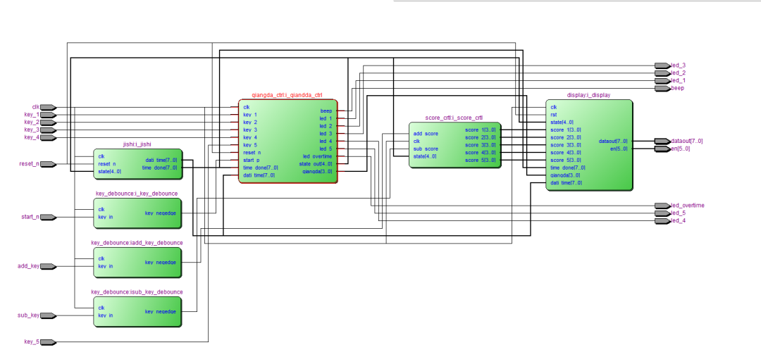 顶层qiangdaqi完成模块例化与信号连线:key_debounce产生开始键与加减分键的稳定触发脉冲;qiangda_ctrl输出系统状态、胜出者与提示信号;jishi根据状态产生倒计时与答题计时;score_crtl维护五路分数寄存器;display将状态、计时、胜出者与分数组织成数码管显示内容。整体数据流为:按键输入→消抖→状态机判定→计时/计分→显示与指示输出。