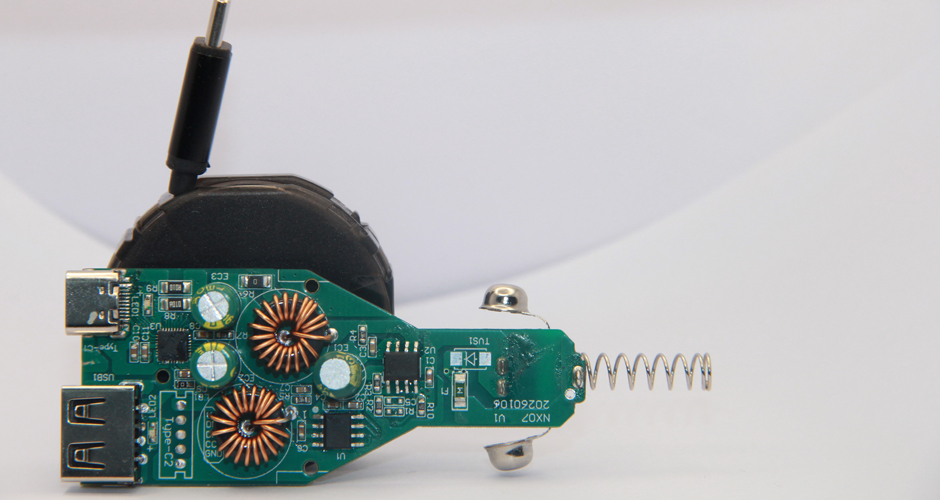PCBA模块正面一览,左边type-C口在上,usb-A口在下,旁边焊接有支持AC双口协议的HUSBXXX,两颗滤波电容。中间位置焊接两颗降压电感和1颗输出滤波电容,旁边焊有CX8831CA集成协议和同步降压转换器和CX8825降压芯片。这套60W多口车充快充方案设计得相当精简,通过简化BOM,能够同步实现降本与缩短产品生产周期。