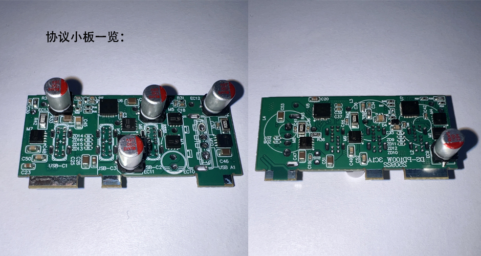 输出端焊接1块协议小板,对应三个USB-C接口和一个USB-A接口,小板上焊接3个降压电感,为独立降压输出,协议小板上还分布了MOS管和DC+协议集成降压芯片CX2908、CX2909。