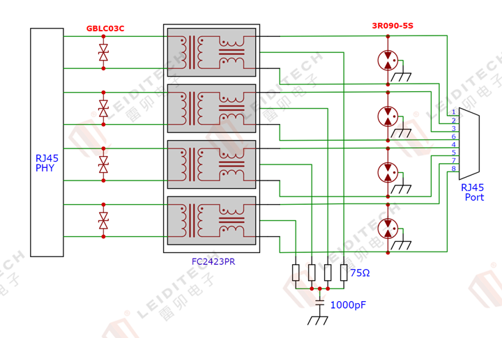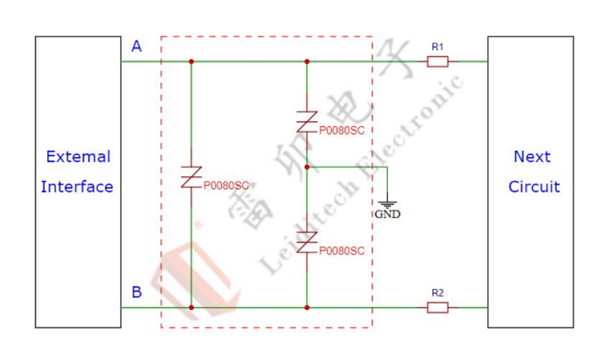 RS-485/RS422接口:采用低残压TSS元件P0080SC(6V双向、100PF),反应时间达ns级,兼顾浪涌与静电防护,满足 IEC61000-4-2(接触放电8kV、空气放电15kV)和IEC61000-4-5(浪涌10/700μs,6KV)标准;