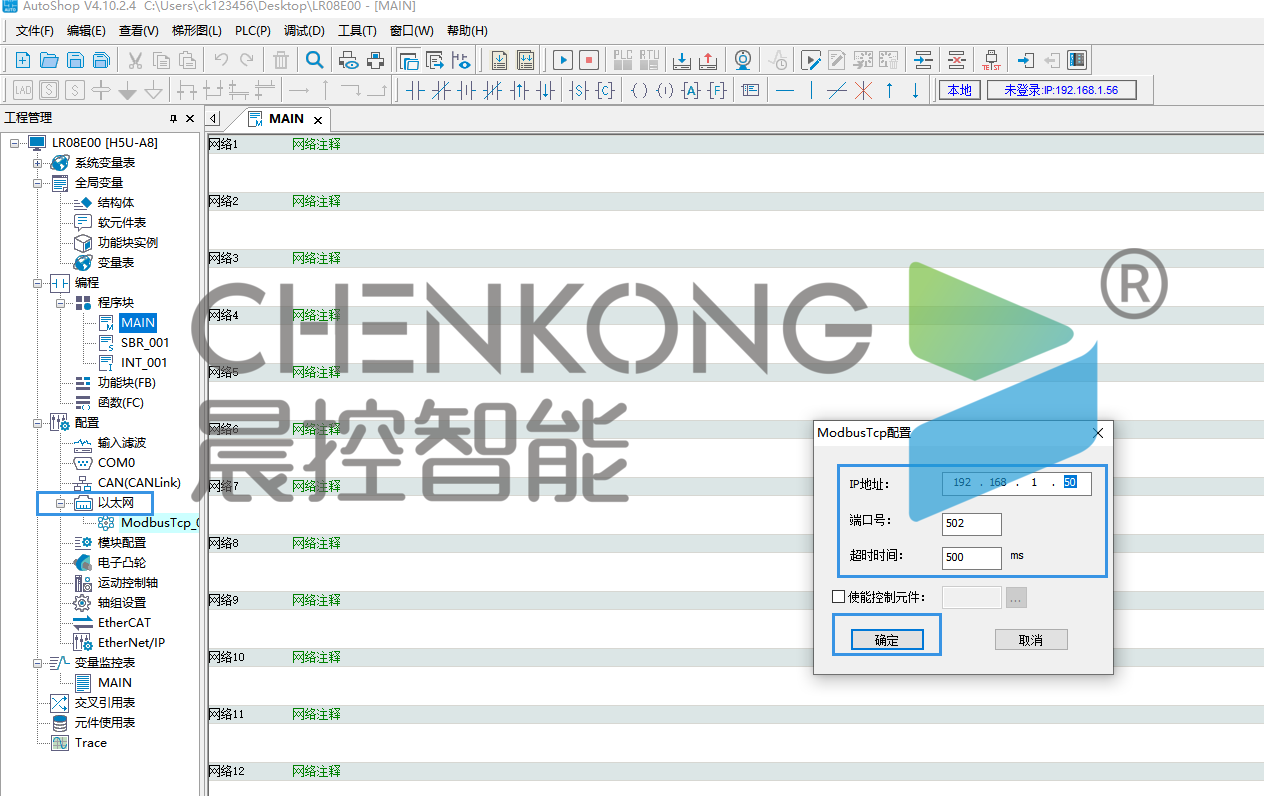 晨控CK-LR08-E00与汇川H5U系列PLC配置MODBUSTCP通讯连接手册