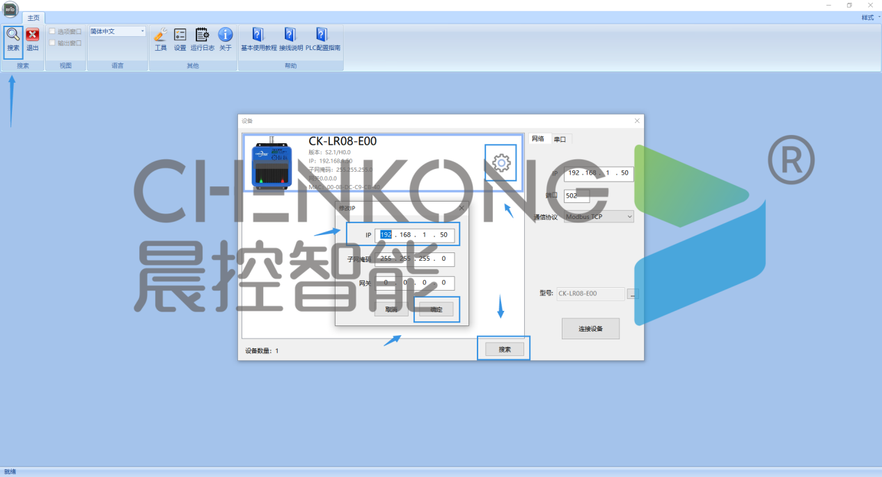 搜索出来设备,点击齿轮,修改ip,确定保存