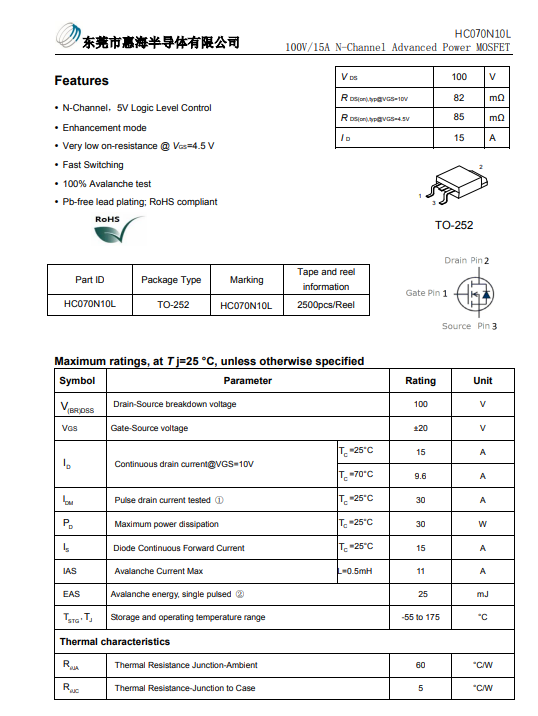 HC070N10L的主要特点是其较低的导通电阻。在VGS = 4.5V的逻辑电平下,其导通电阻(RDS(on))可控制在较低水平。这意味着在15A的持续漏极电流下,能够有效减少导通损耗,提升电源转换效率,尤其适合由微控制器直接驱动的低压电路。