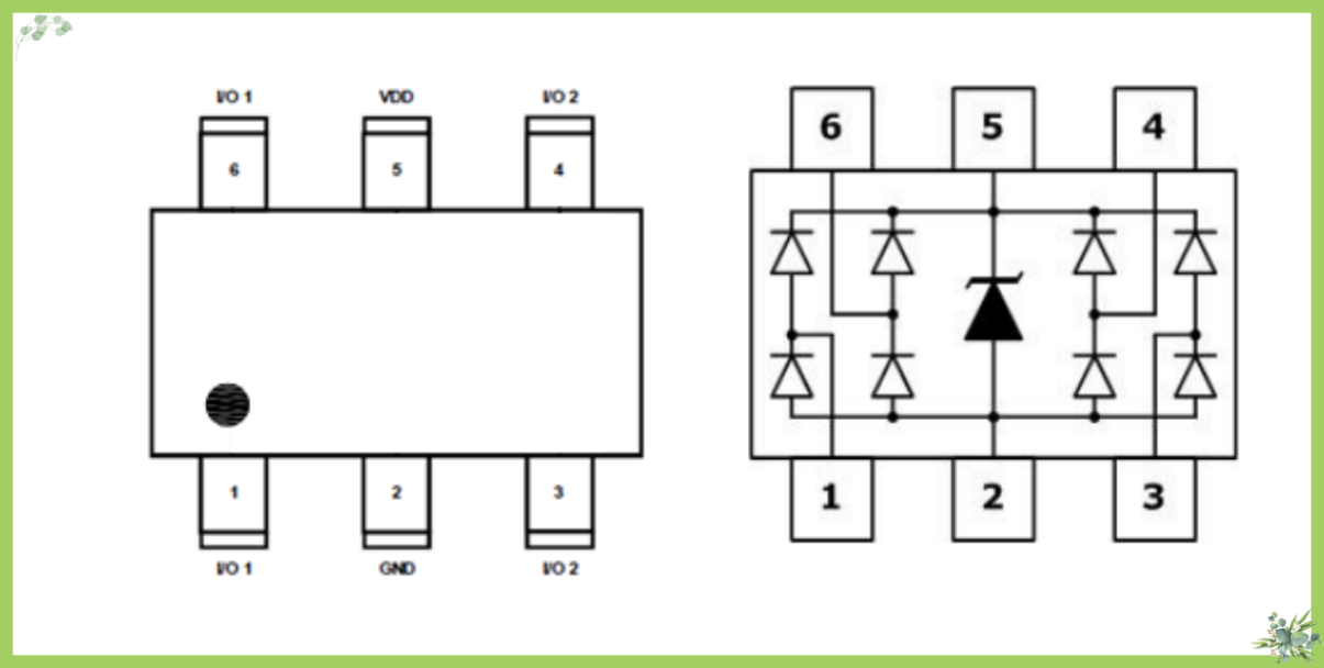 根据不同用户电路环境和设备应用场景的要求,ESD防护二极管的参数选择亦存在差异。为此,上海雷卯EMC小哥针对不同客户的实际需求,提供多种型号参数的解决方案。其中,SOT23-6封装因其广泛应用而具有较高代表性,其封装外观与内部电路结构如下所示: