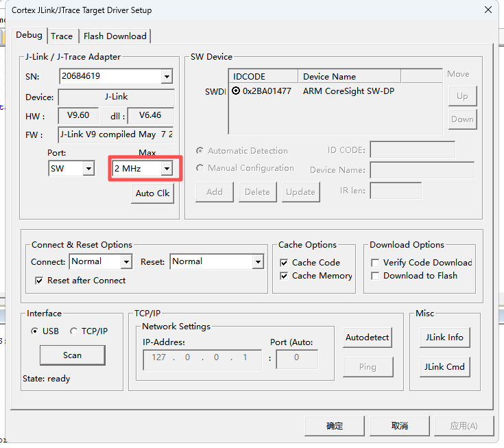 实操:主流调试器(J-Link/ST-Link)将波特率降至10M以下,从5MHz逐步降低(5MHz→2MHz→1MHz),以通信稳定为前提即可,避免过低影响下载速度。