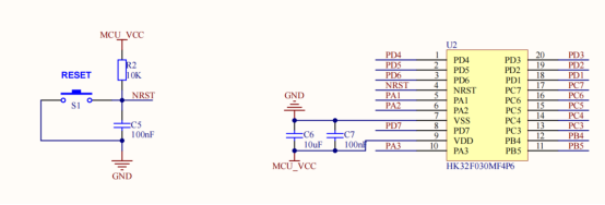 给NRST添加RC耦合电路,避免误复位,PCB设计初期可直接加入: