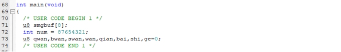 /* USER CODE BEGIN 1 */ u8 smgbuf[8]; int num = 87654321; u8 qwan,bwan,swan,wan,qian,bai,shi,ge=0; /* USER CODE END 1 */