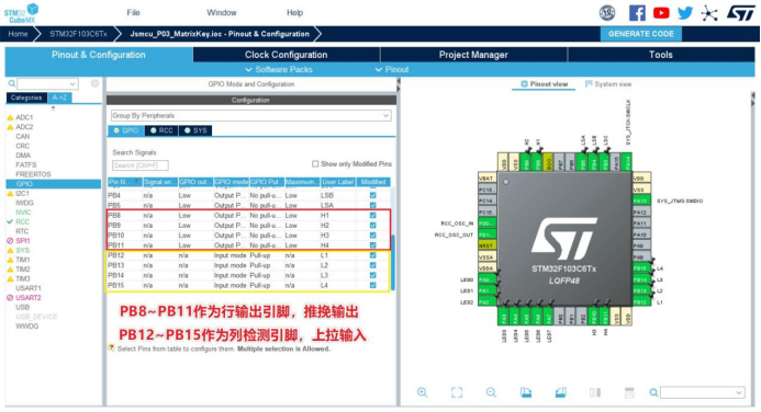 PB8PB11设置为推挽输出,PB12PB15设置为上拉输入。