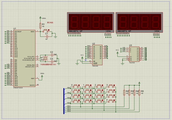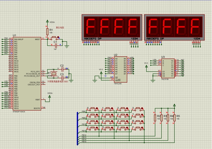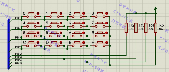 4*4 矩阵按键引出的8根控制线直接连接到stm32单片机的PB8-PB15口上。电路中的PB08连接矩阵键盘的第1行,PB12连接矩阵键盘第1列。使用数码管显示按下按键的值,数码管部分同第10章。