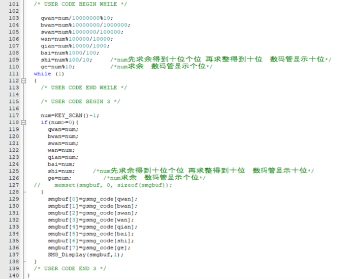 /* USER CODE BEGIN WHILE */ qwan=num/10000000%10; bwan=num%10000000/1000000; swan=num%1000000/100000; wan=num%100000/10000; qian=num%10000/1000; bai=num%1000/100; shi=num%100/10; /*num先求余得到十位个位 再求整得到十位 数码管显示十位*/ ge=num%10; /*num求余 数码管显示个位*/ while (1) { /* USER CODE END WHILE */ /* USER CODE BEGIN 3 */ num=KEY_SCAN()-1; if(num>=0){ qwan=num; bwan=num; swan=num; wan=num; qian=num; bai=num; shi=num; /*num先求余得到十位个位 再求整得到十位 数码管显示十位*/ ge=num; /*num求余 数码管显示个位*/ // memset(smgbuf, 0, sizeof(smgbuf)); } smgbuf[0]=gsmg_code[qwan]; smgbuf[1]=gsmg_code[bwan]; smgbuf[2]=gsmg_code[swan]; smgbuf[3]=gsmg_code[wan]; smgbuf[4]=gsmg_code[qian]; smgbuf[5]=gsmg_code[bai]; smgbuf[6]=gsmg_code[shi]; smgbuf[7]=gsmg_code[ge]; SMG_Display(smgbuf,1); } /* USER CODE END 3 */