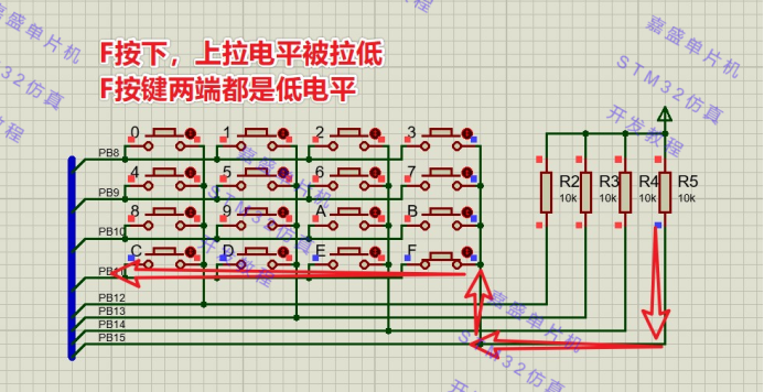 PB8PB11连接4行,PB12PB15连接四列,每行每列都有一个按键连接,当某个按键被按下,它所对应的行和列就会被接通。比如说,我们将四列设置成上拉输入状态,四行设置成推挽输出,这个时候读PB12BB15的引脚状态应该全是高电平,然后我们按下了F按键,此时我们把每一列对应的引脚挨个输出低电平,再读PB12PB15的引脚状态,就会发现PB15的引脚变为低电平了(因为F按键是连接PB15引脚),就可以定位到是哪一行的按键被按下。之后再根据是在哪一列扫描时发生变化的,就可以定位出按键所在列。