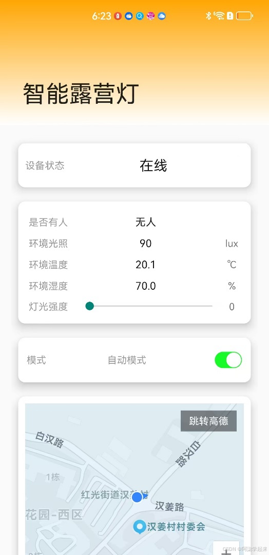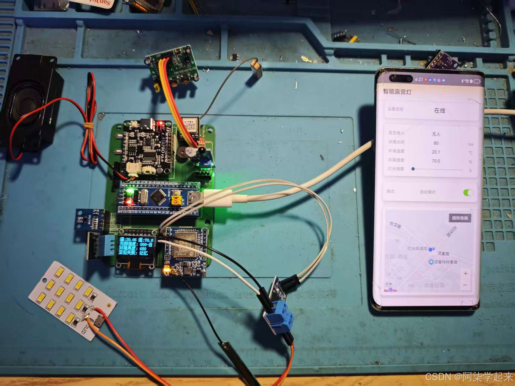 本系统以STM32F103C8T6为主控,集成了4G模块(支持联网与一键短信发送)、GPS定位模块、0.96寸OLED显示屏、DHT11温湿度传感器、BH1750光照传感器、补光灯、HC-SR501人体红外传感器、ASR PRO语音模块、红外传感器及LED与蜂鸣器,实现了环境温湿度与光照监测、光线不足时自动补光、“人来亮灯、人走延时熄灭”的智能照明控制、语音指令操控以及异常靠近实时报警等功能;同时通过MQTT协议连接云平台,配套APP可实时展示传感器数据与GPS定位信息,支持远程切换工作模式、远程控制LED开关,从而构建出一款具备本地智能感知、语音交互、远程监控与定位追踪能力的多功能露营灯方案。