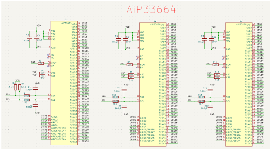 5)AiP33664:IIC接⼝共阴极的恒流LED驱动芯片,点阵大小可选择,最大支持43段9位,SEG端口最大电流为45mA,支持四种从机地址。