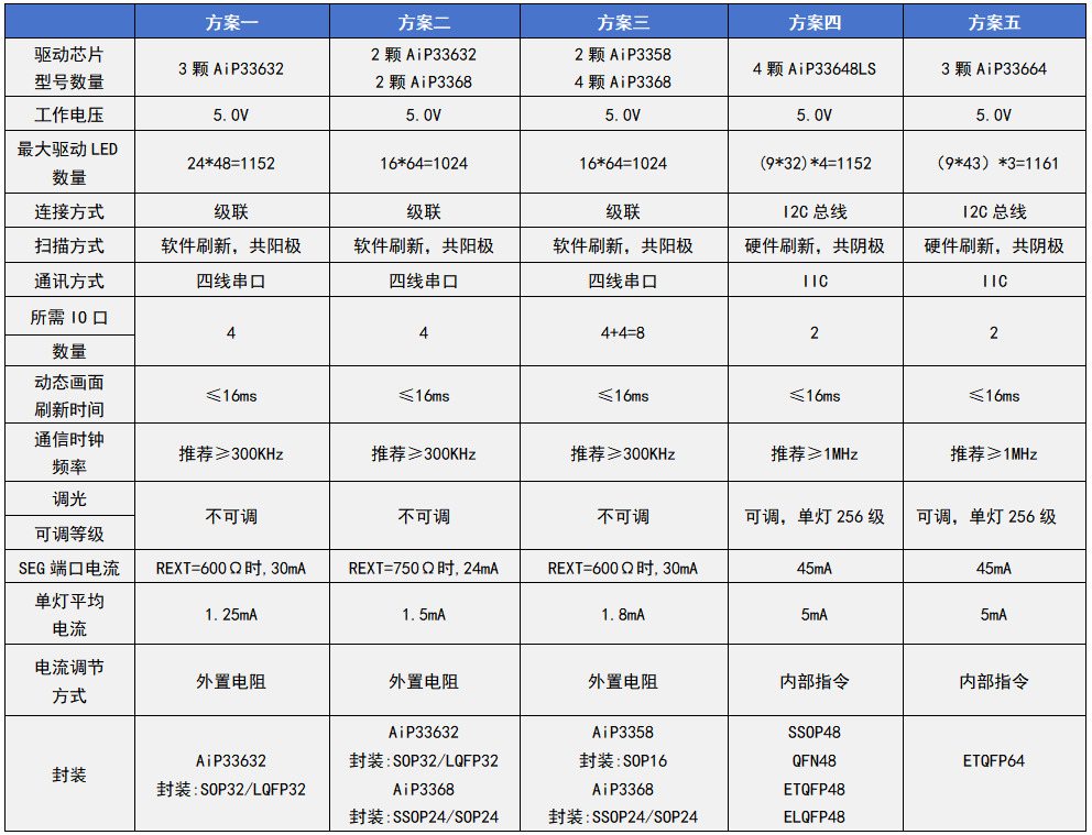 1)AiP33632:8*16共阳极恒流LED驱动控制芯片,提供8通道阳极公共输出端和16通道阴极恒流输出,SEG端口最大电流为40mA,多颗可级联。
