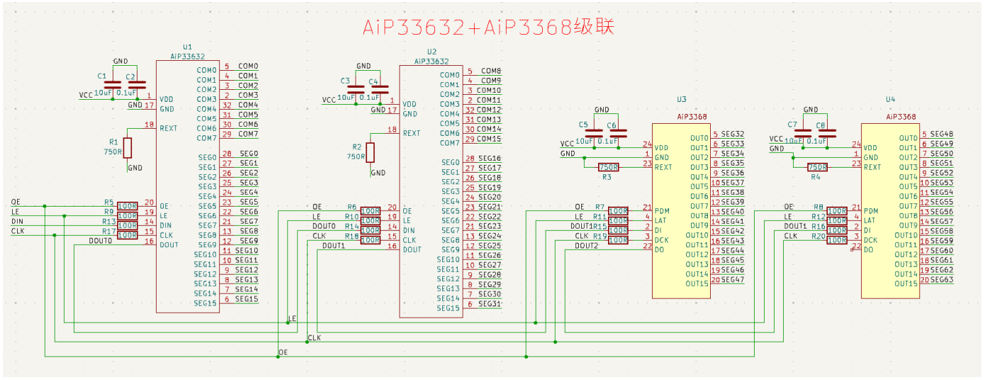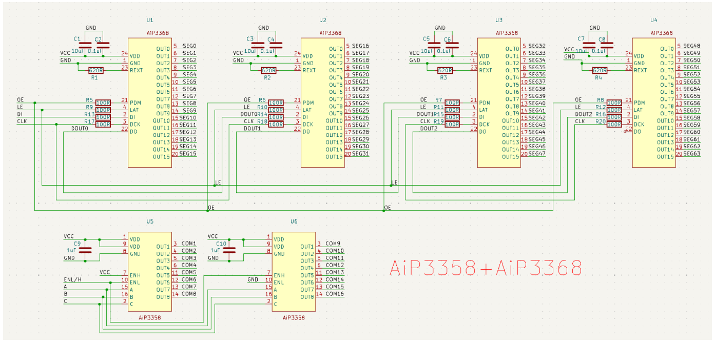 2)AiP3368:16通道高精度恒流LED驱动芯片,OUT端口最大输出电流为45mA,多颗可级联。