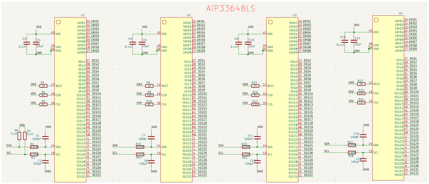 4)AiP33648LS:带低功耗模式的IIC接⼝共阴极32段9位恒流LED驱动芯片,SEG端口最大电流为45mA,支持四种从机地址。