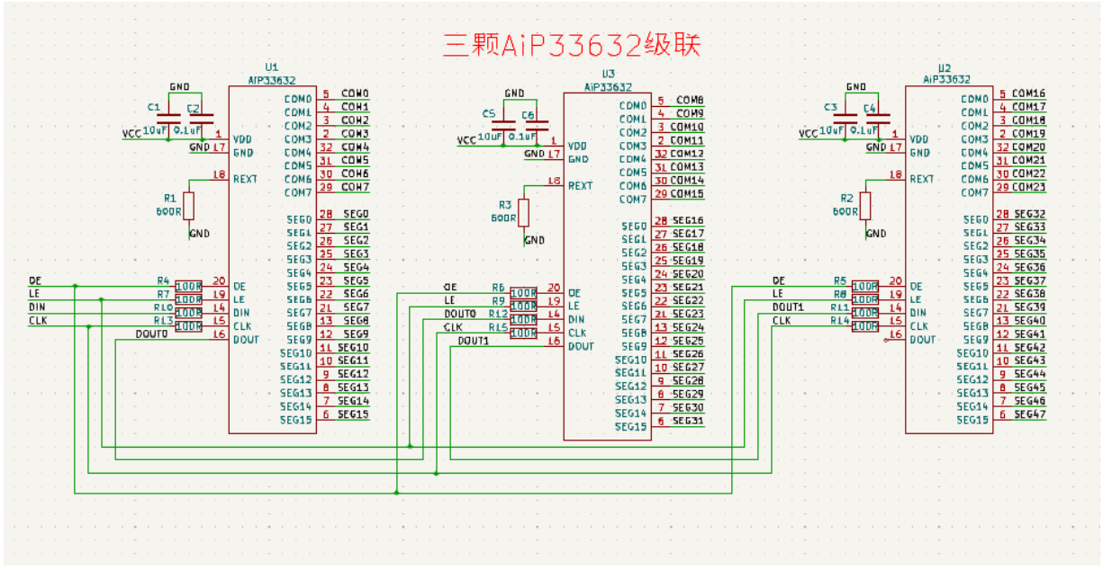 2)硬件要点:考虑到COM端口的最大驱动电流为2A,以及每个COM最多控制64个SEG,推荐REXT为600Ω,SEG输出电流约为30mA,此时单个SEG的平均电流理论上为1.8mA。