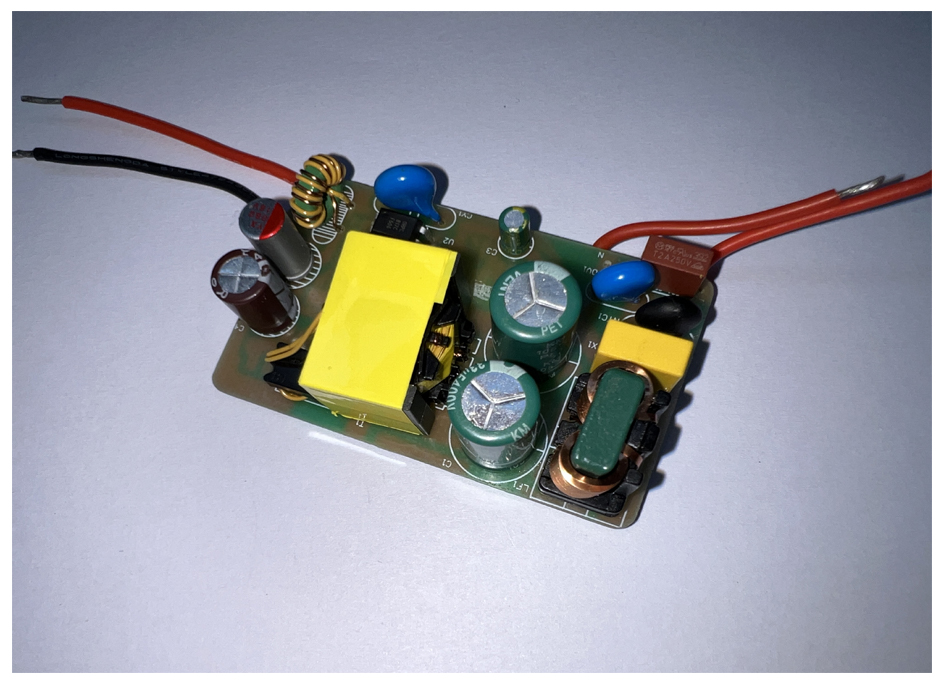 从这款Demo正面来看,其采用开放式 PCB 电源板设计,器件分区清晰,板子中间是一颗体积较大的高频变压器,两侧围绕布置了滤波电容、固态电容、电感、Y电容、NTC、X电容、保险丝、插件光耦等器件,属于典型的隔离式充电电源方案。背面焊接有CX716碳化硅主控电源芯片、碳化硅功率MOSFET-CX80TS065、同步整流芯片、二极管、整流桥等元器件。电路结构简单、较少的外围元器件,适用于小功率AC/DC电源适配器、充电器。
