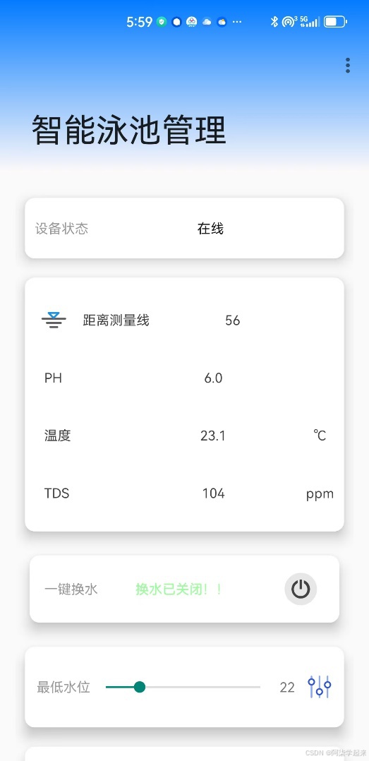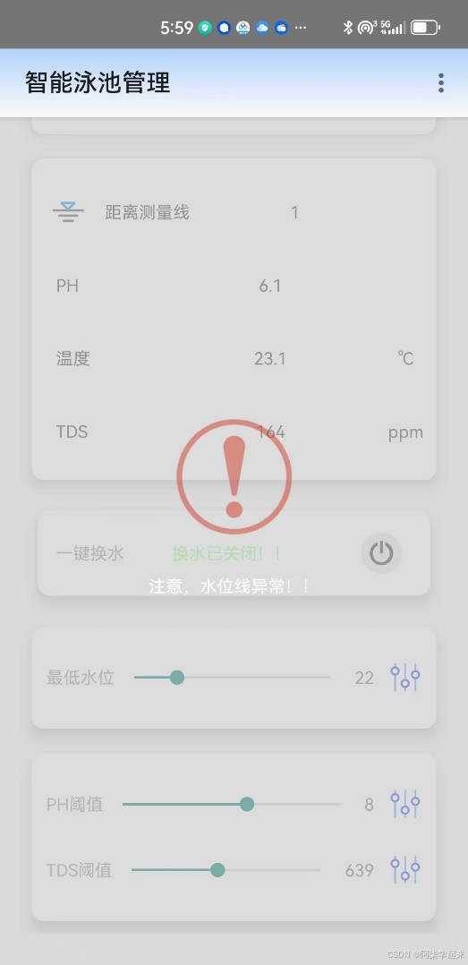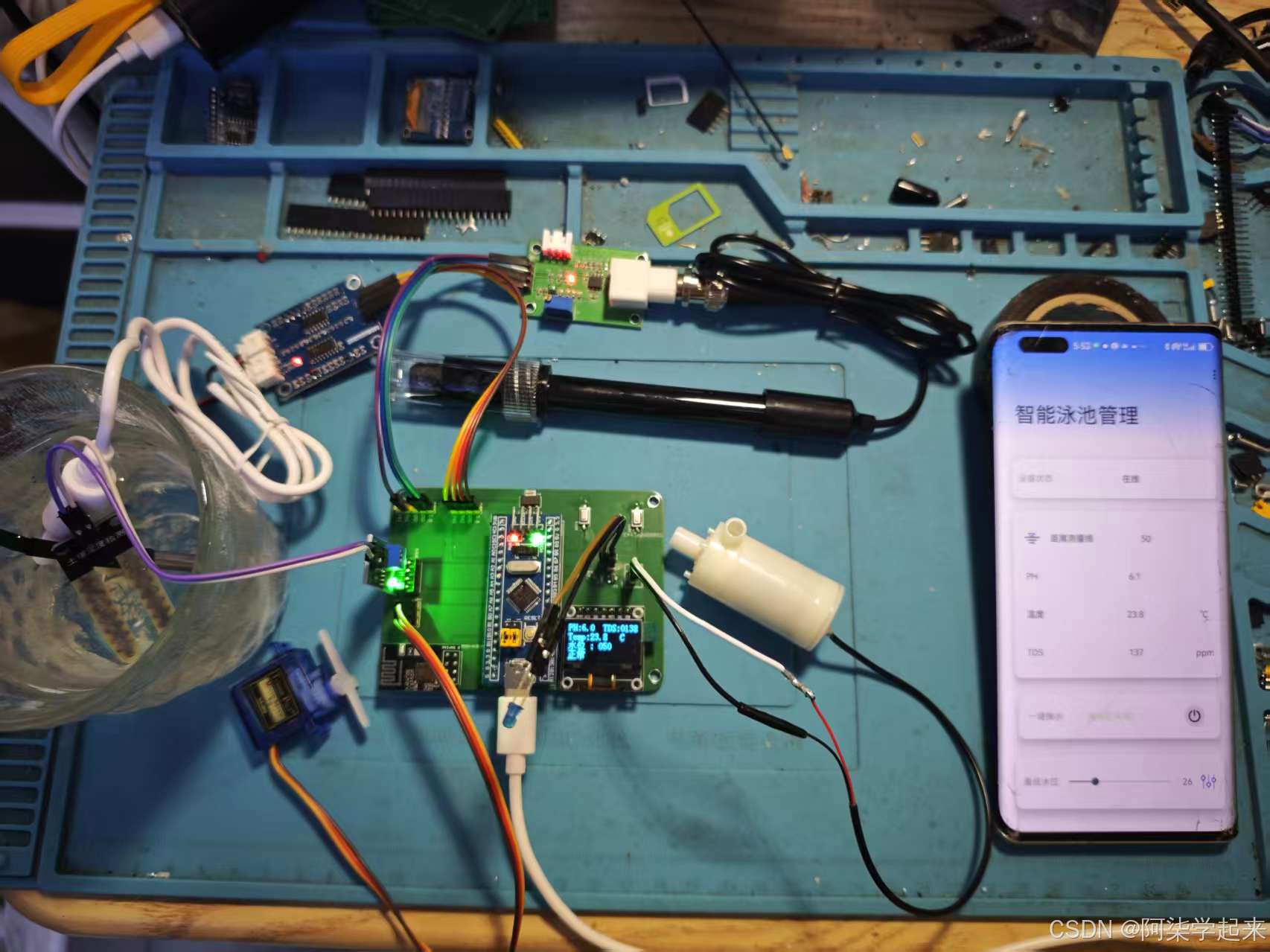 本项目设计了一套基于STM32F103C8T6的智慧泳池管理系统,硬件端集成0.96寸OLED显示屏、LED指示灯、温度传感器、WiFi模块(ESP8266)、水位传感器(湿度传感器模拟)、按键模块、pH传感器、TDS传感器、舵机及水泵,实现池水pH值、TDS值、温度和水位的实时监测,并通过按键一键控制水泵进水与舵机排水,长按任意按键可进入换水模式;设备通过MQTT协议连接云平台,将数据上传至手机APP,APP端可动态展示pH、TDS、水位等数据,支持用户设置报警阈值并在数据异常时弹出提示,同时远程控制换水操作,从而实现泳池水质的智能化管理与远程监控。演示视频以网盘链接形式提供。