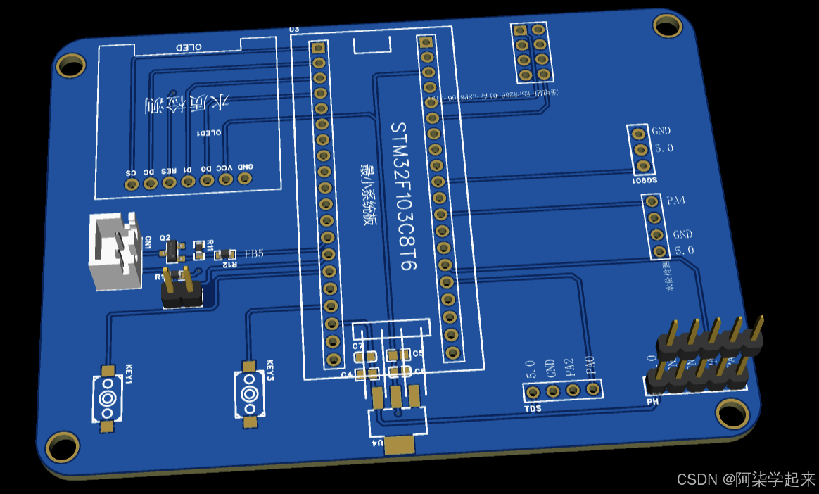 - 0.96寸OLDE:用于显示当前当前ph值、当前tds值,最上方显示游泳池水质检测;