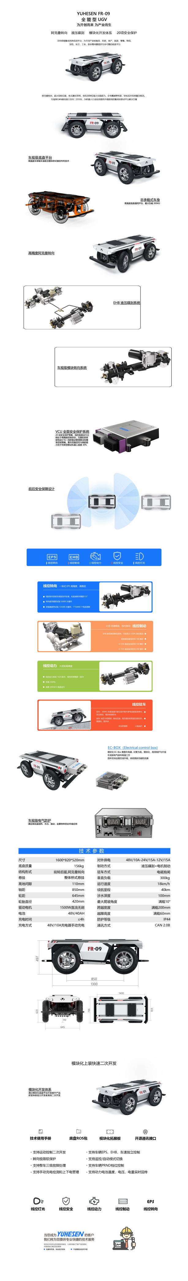煜禾森FR-09 Pro 是一款全能型轮式机器人线控移动平台,它采用阿克曼结构,驱动后置,相对于差动结构的底盘,在普通路面上 FR-09 Pro 具有更快速的行走能力和较强的负载能力,同时对轮胎的磨损也更小,搭配整体桥式悬挂,能够通过减速带等常见障碍物,更适合长时间室外运行;并且,该底盘是基于 VCU 整车控制构建的底层控制系统,采用 CAN 总线管理,具有高精度、模块化等特点;通过搭载激光雷达、GPS、机械臂等模块和导航系统广泛应用于自动驾驶、无人巡检、物流、运输配送、科研以及各种新的需要移动底盘的应用探索中。