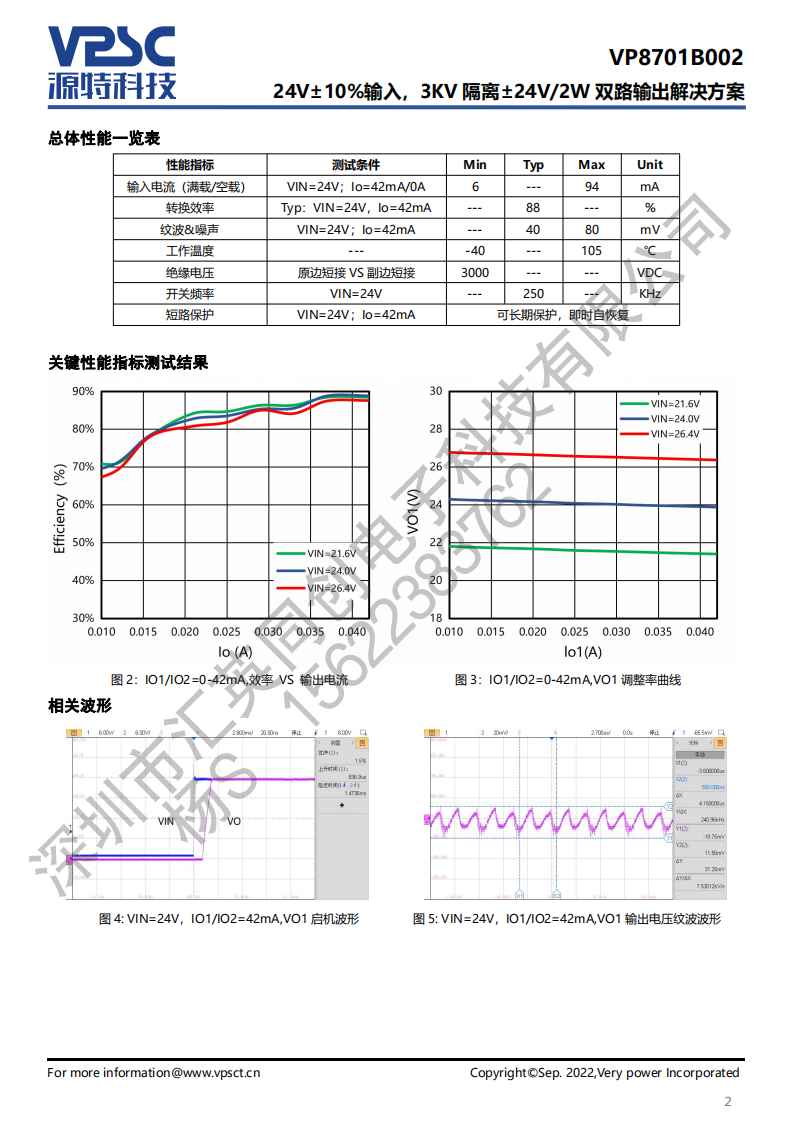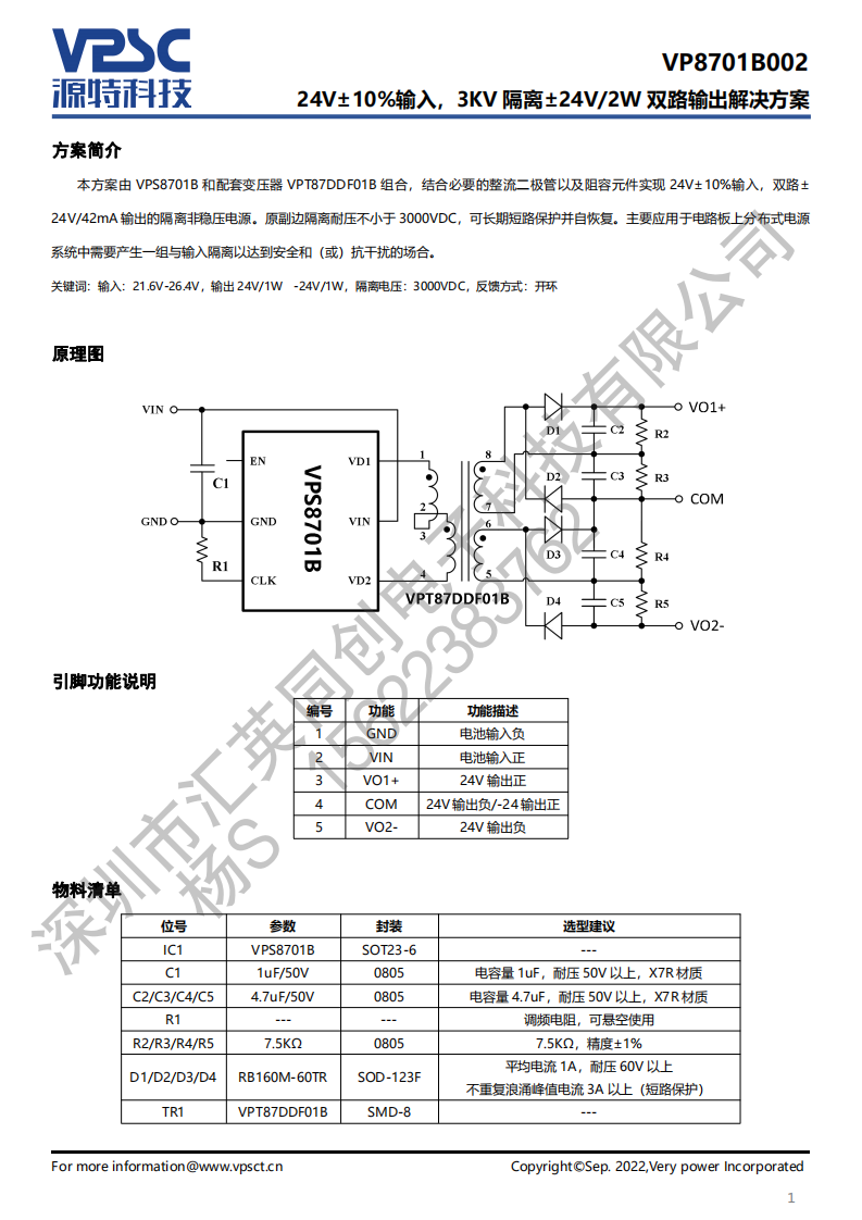 本方案由 VPS8701B 和配套变压器 VPT87DDFO1B 组合,结合必要的整流二极管以及阻容元件实现 24V+10%输入,双路24V/42mA 输出的隔离非稳压电源。原副边隔离耐压不小于 3000VDC,可长期短路保护并自恢复。主要应用于电路板上分布式电源系统中需要产生一组与输入隔离以达到安全和 (或)抗干扰的场合。