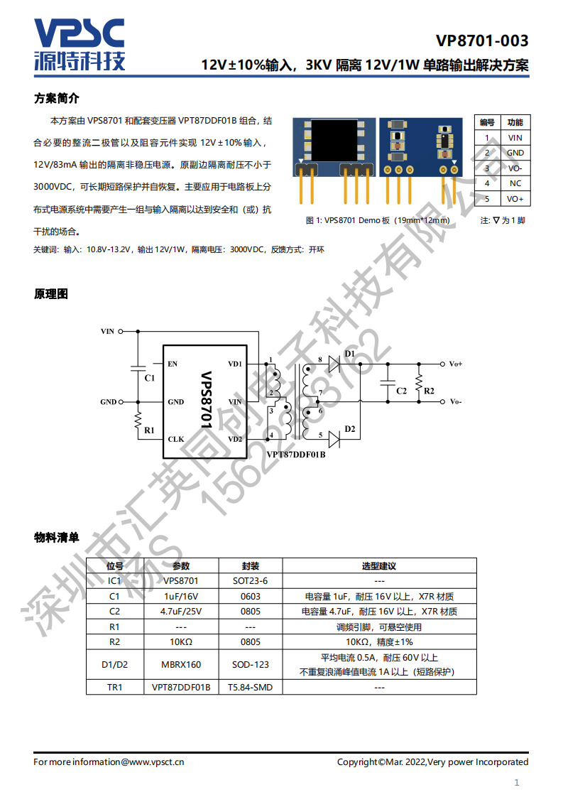 12V+10%输入,3KV 隔离 15V/1W 单路输出解决方案