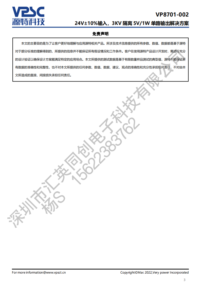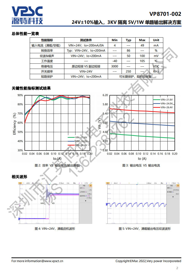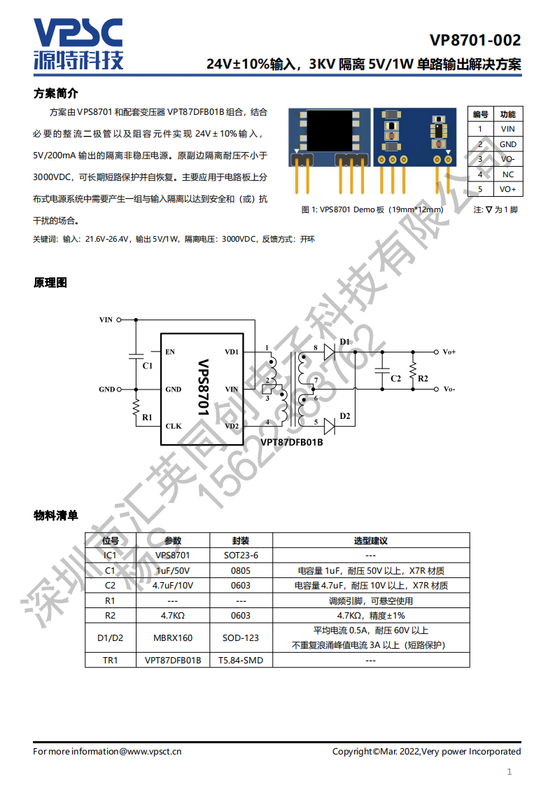 本方案由 VPS8701 和配套变压器 VPT87DFB1B组合,结合必要的整流二极管以及阻容元件实现24V±10%输入,5V/200mA 输出的隔离非稳压电源。原副边隔离耐压不小于3000VDC,可长期短路保护并自恢复。主要应用于电路板上分布式电源系统中需要产生一组与输入隔离以达到安全和(或)抗干扰的场合。