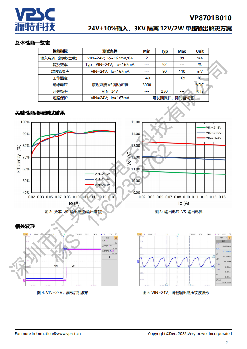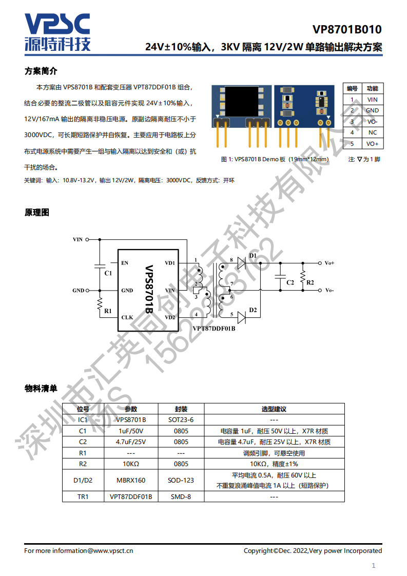 本方案由 VPS8701B 和配套变压器 VPT87DDF01B组合,结合必要的整流二极管以及阻容元件实现24V±10%输入,12V/167mA 输出的隔离非稳压电源。原副边隔离耐压不小于3000VDC,可长期短路保护并自恢复。主要应用于电路板上分布式电源系统中需要产生一组与输入隔离以达到安全和(或)抗干扰的场合。