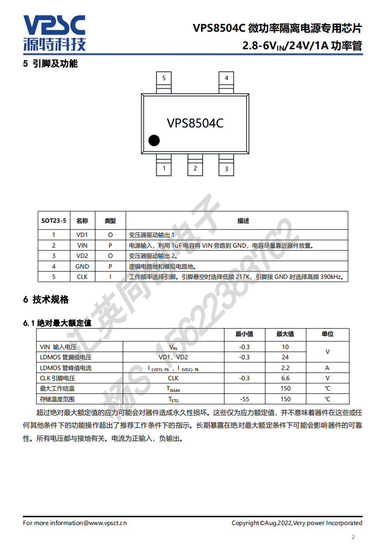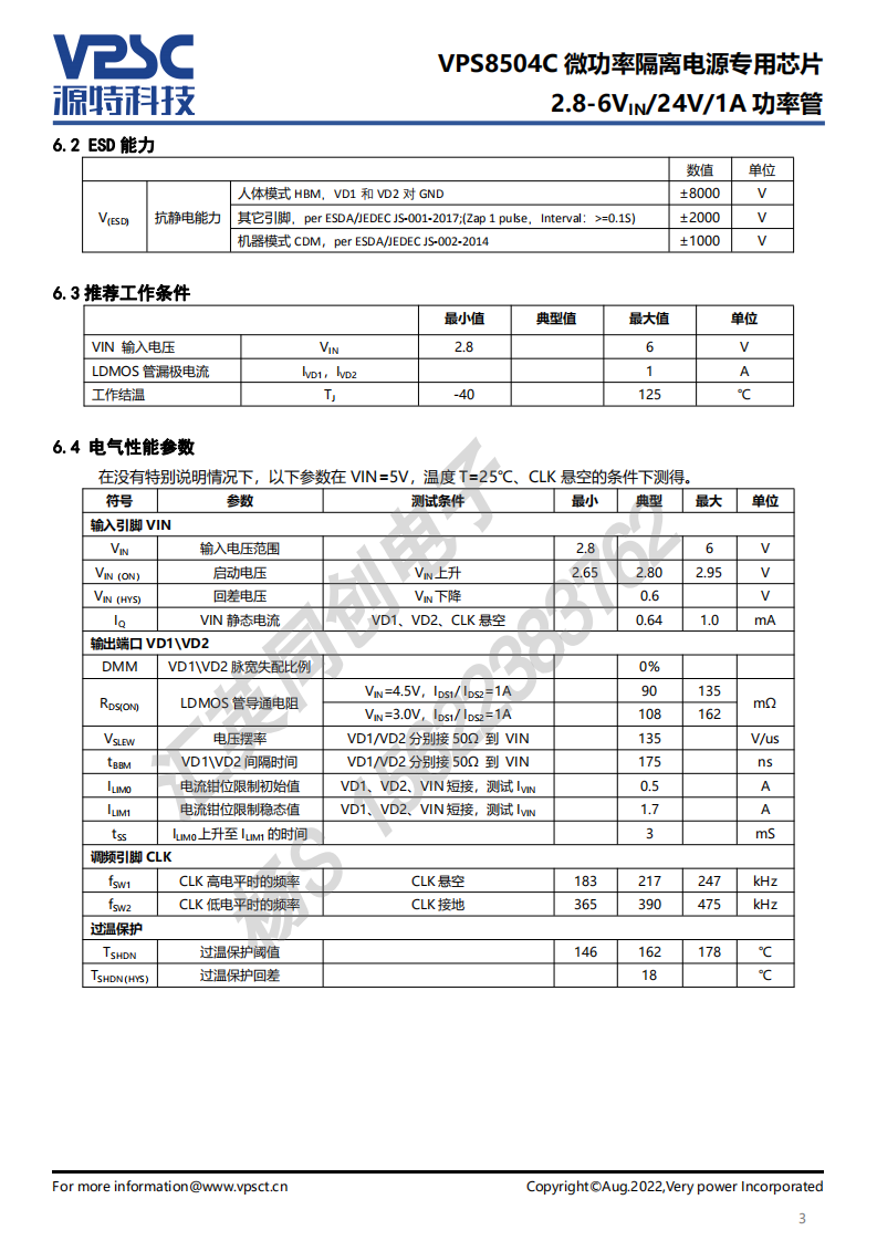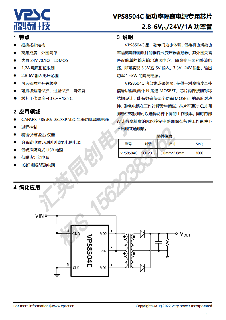 VPS8504C 是一款专门为小体积、低待机功耗微功率隔离电源而设计的推挽式变压器驱动器,其外围只需匹配简单的输入输出滤波电容、隔离变压器和整流电路,即可实现 3.3V或 5V 输入、3.3V~24V 输出、输出功率1~3W 的隔离电源