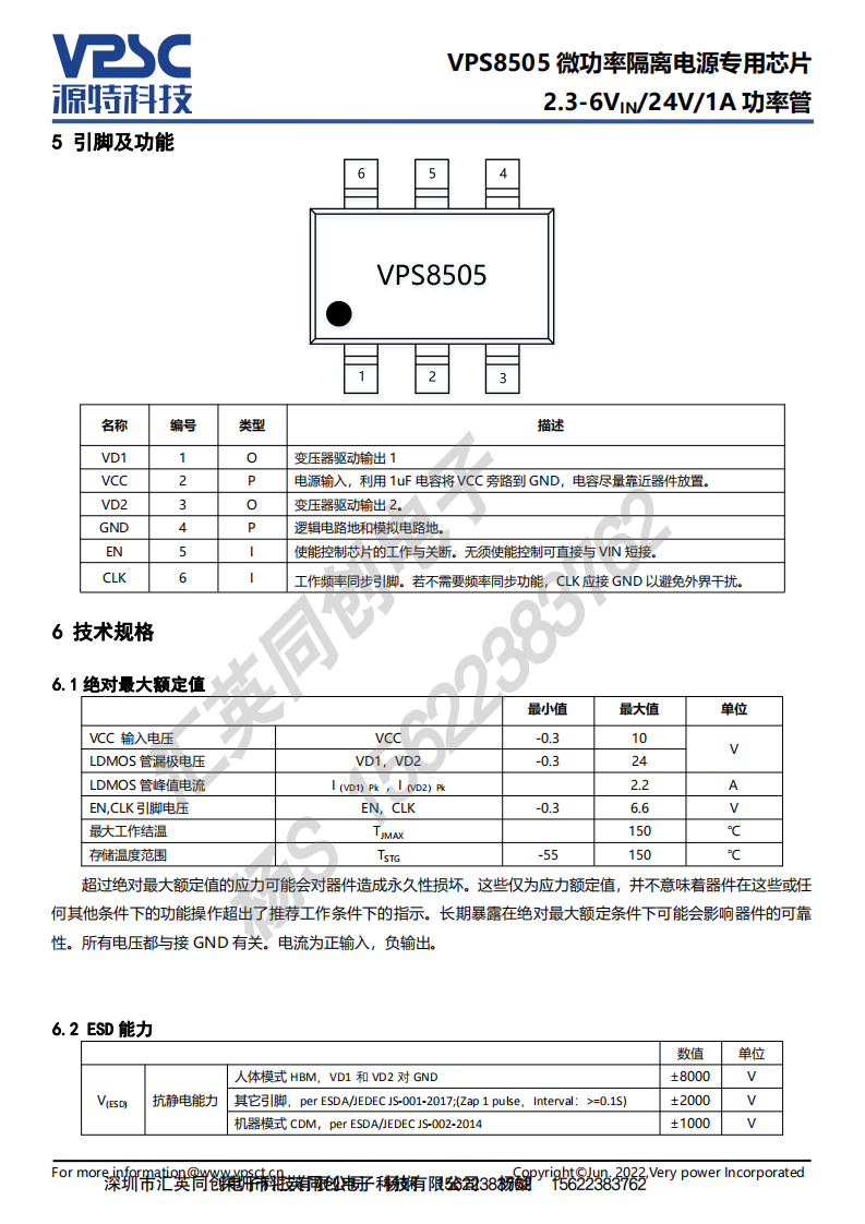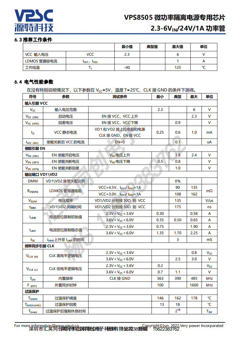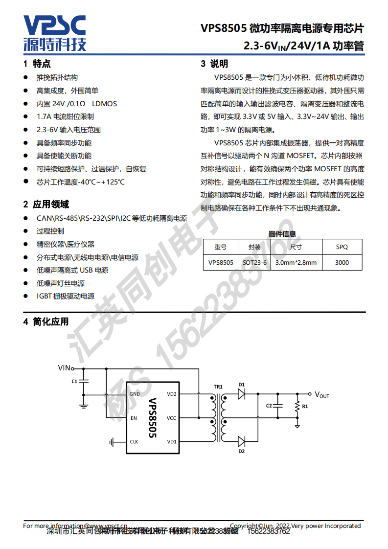VPS8505 是一款专门为小体积、低待机功耗微功率隔离电源而设计的推挽式变压器驱动器,其外围只需匹配简单的输入输出滤波电容、隔离变压器和整流电路,即可实现 3.3V或 5V 输入、3.3V~24V 输出、输出功率 1~3W 的隔离电源