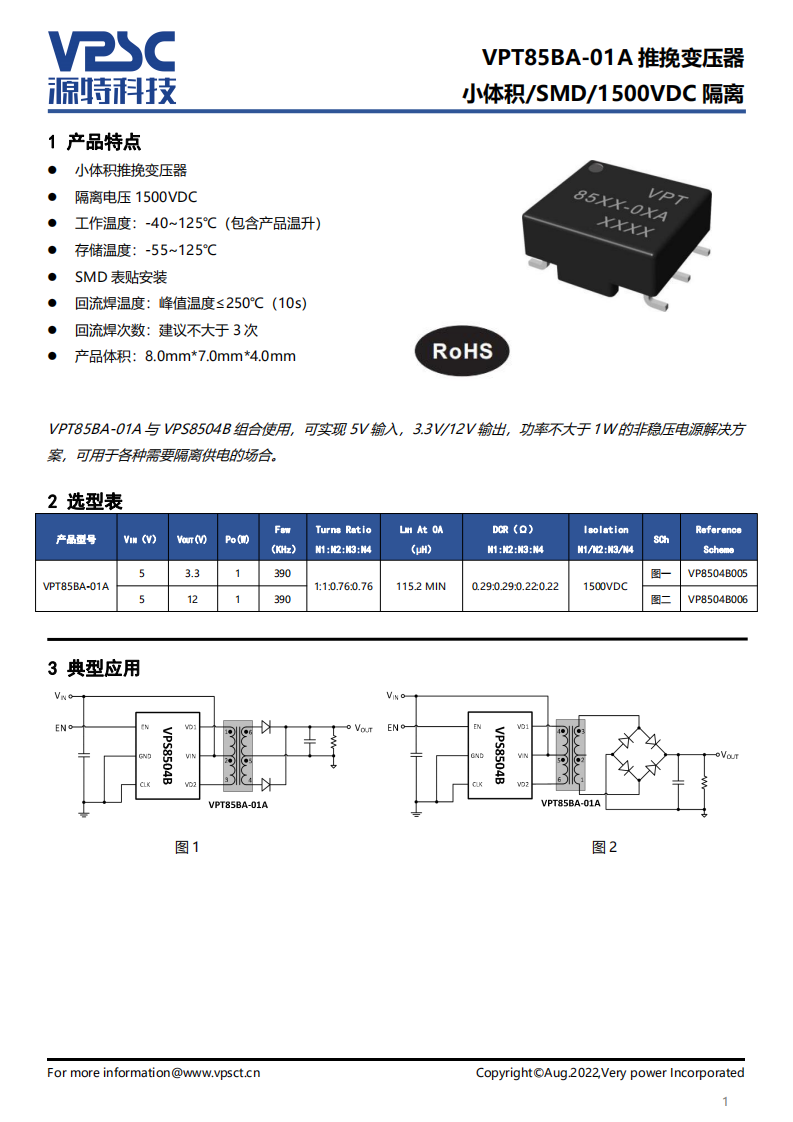 VPT85BA-01A 与 VPS8504B 组合使用,可实现 5V 输入,3.3V/12V 输出,功率不大于 1W 的非稳压电源解决方案,可用于各种需要隔离供电的场合。