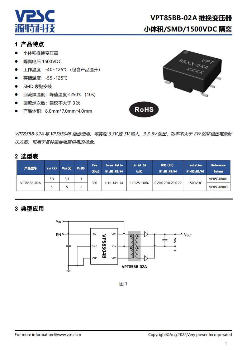 VPT85BB-02A 与 VPS8504B 组合使用,可实现 3.3V 或 5V 输入,3.3-5V 输出,功率不大于 2W 的非稳压电源解决方案,可用于各种需要隔离供电的场合。