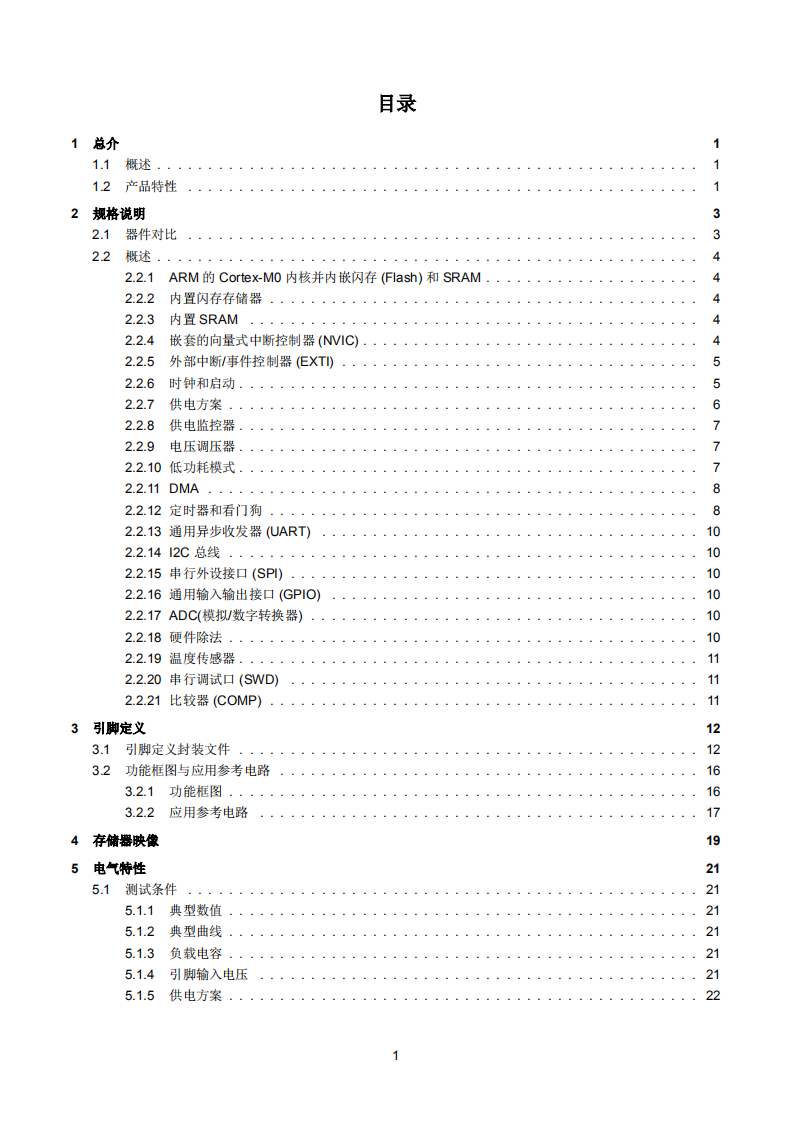 本产品使用高性能的 ARM® Cortex®-M0 为内核的 32 位微控制器,5V 输出的 LDO 稳压器、三组具备有自举二极管的 N 通道半桥栅极驱动器。MCU 最高工作频率可达 72MHz,内置高速存储器,丰富的 I/O 端口和外设连接到外部总线。本产品包含 1 个 12 位的 ADC、1 个比较器、1 个 16 位通用定时器、1 个 32 位通用定时器、3 个 16 位基本定时器、和 1个 16 位高级定时器。还包含标准的通信接口:1 个 I2C 接口、1 个 SPI 接口和 1 个 UART接口。