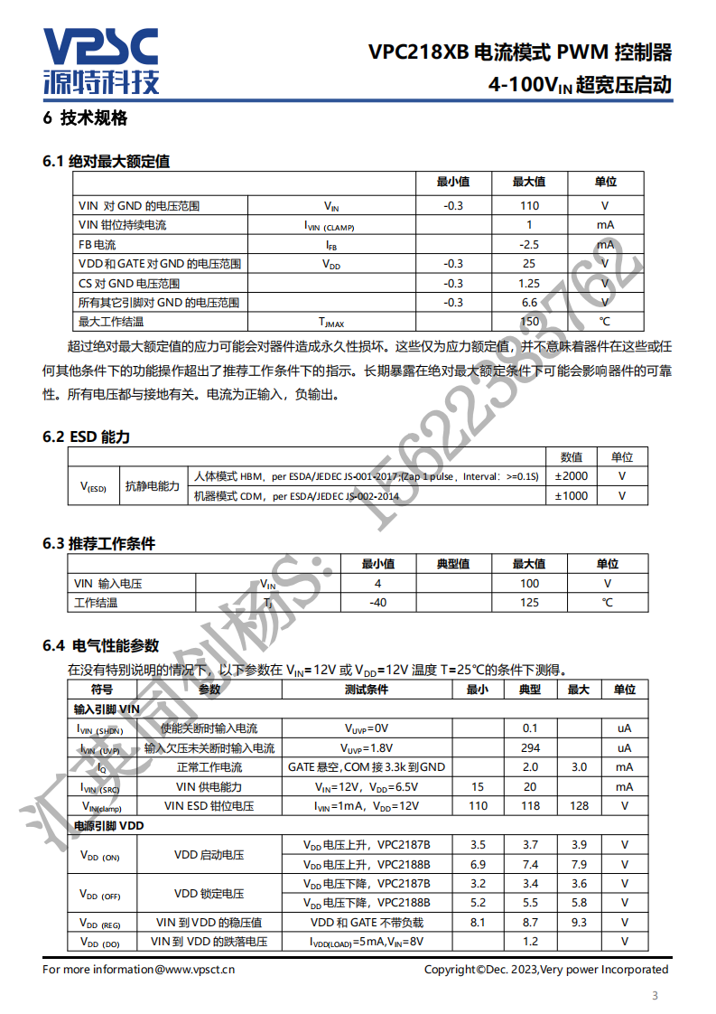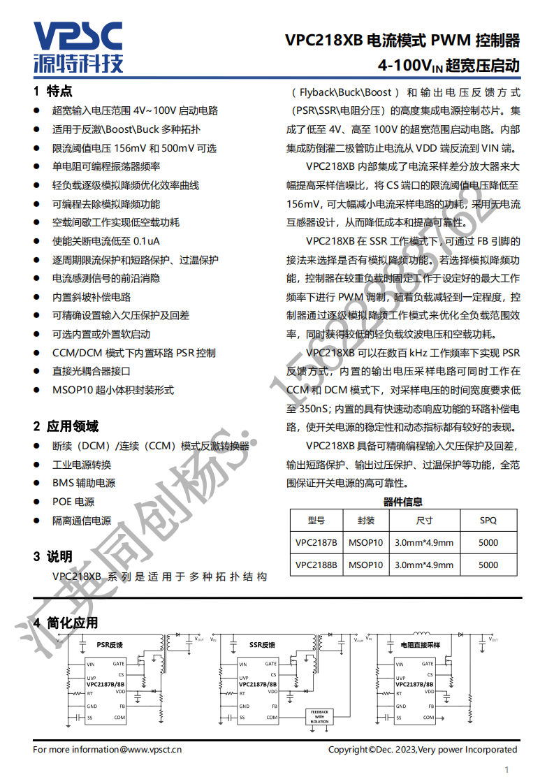 VPC218XB系列是适用于多种拓扑结构(FlybackBuckBoost)和输出电压反馈方式(PSRSSR电阻分压)的高度集成电源控制芯片。集成了低至4V、高至100V的超宽范围启动电路。内部集成防倒灌二极管防止电流从VDD端反流到VIN端。