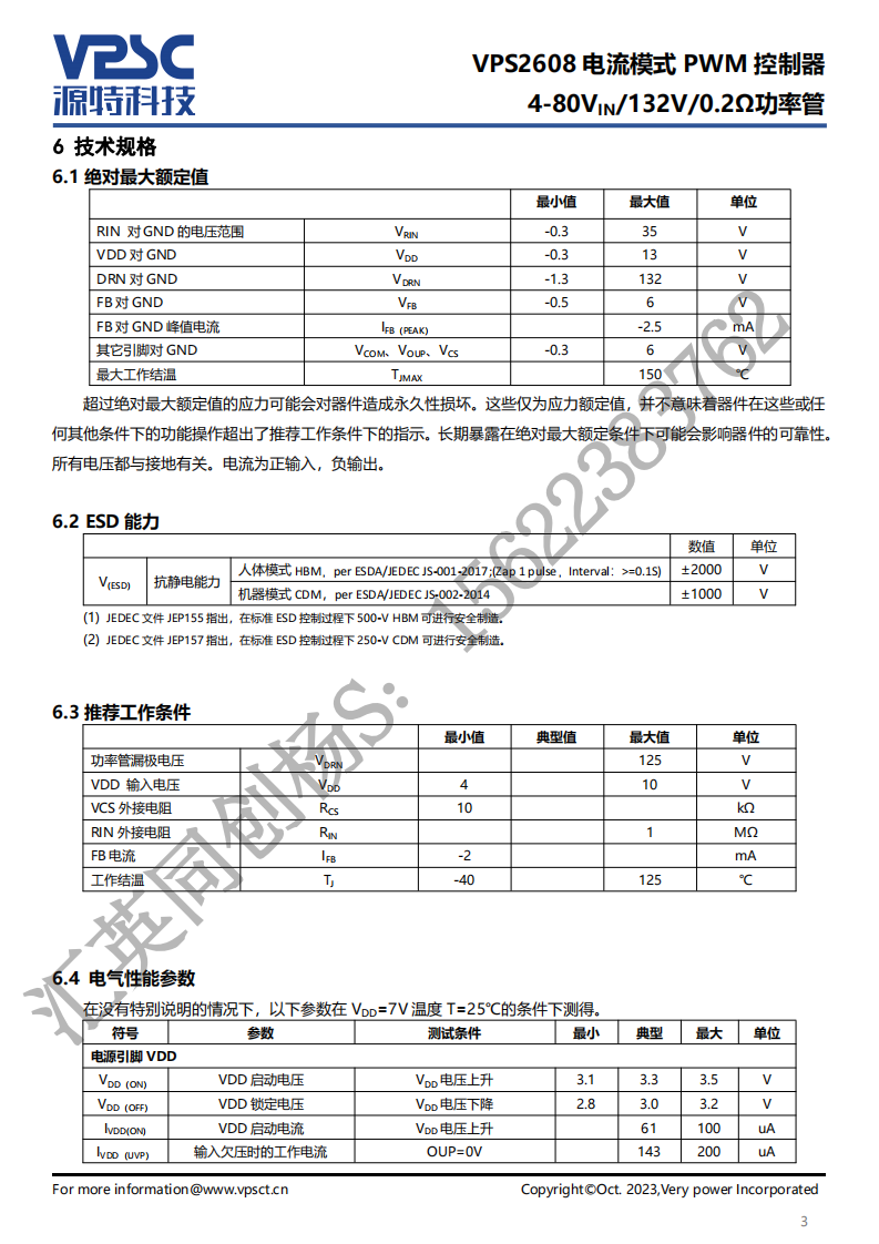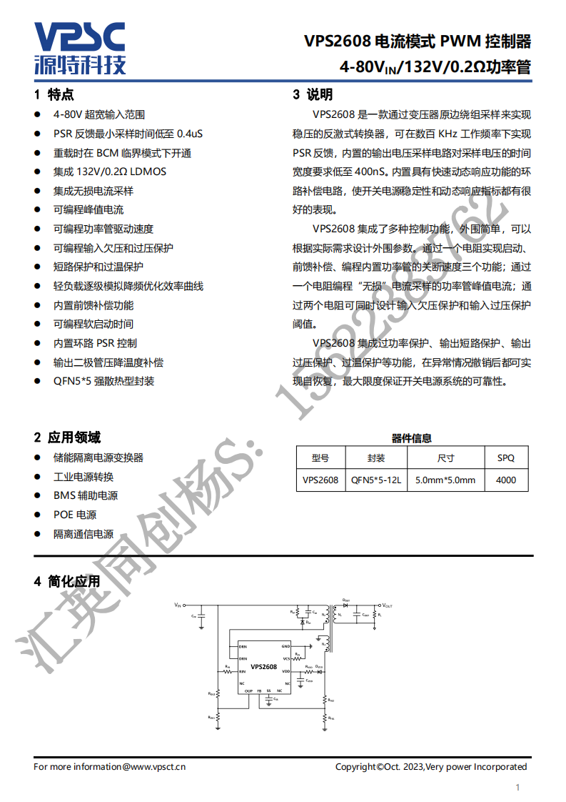 VPS2608是一款通过变压器原边绕组采样来实现、稳压的反激式转换器,可在数百KHz工作频率下实现PSR反馈,内置的输出电压采样电路对采样电压的时间宽度要求低至400nS。内置具有快速动态响应功能的环路补偿电路,使开关电源稳定性和动态响应指标都有很好的表现。