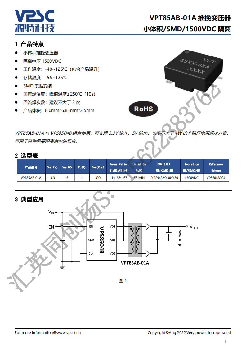 VPT85AB-01A与VPS8504B组合使用,可实现3.3V输入,5V输出,功率不大于1W的非稳压电源解决方案,可用于各种需要隔离供电的场合。