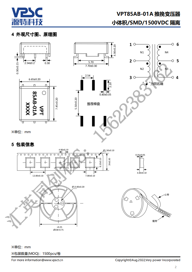 扫码加入VPT85AB-01A推挽变压器 小体积/SMD/1500VDC隔离