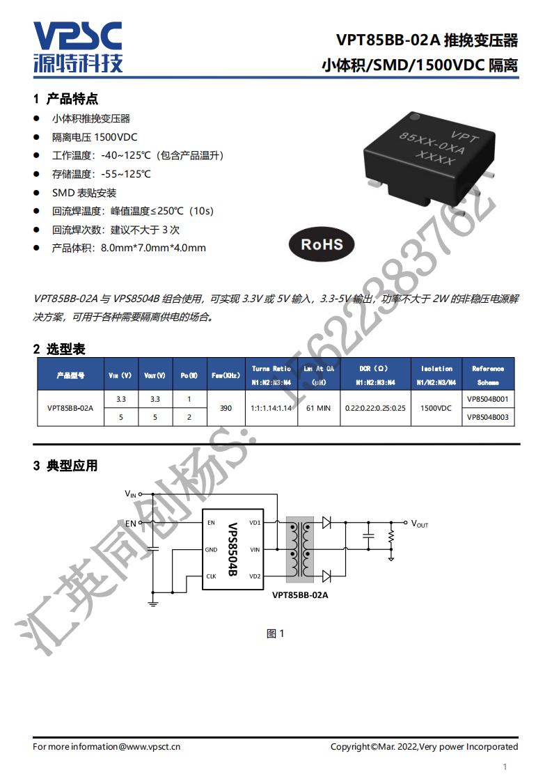 VPT85BB-02A与VPS8504B组合使用,可实现3.3V或5V输入,3.3-5V输出,功率不大于2W的非稳压电源解决方案,可用于各种需要隔离供电的场合。