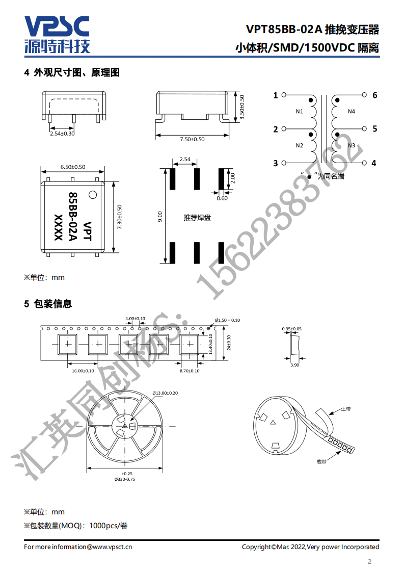 扫码加入VPT85BB-02A推挽变压器 小体积/SMD/1500VDC隔离