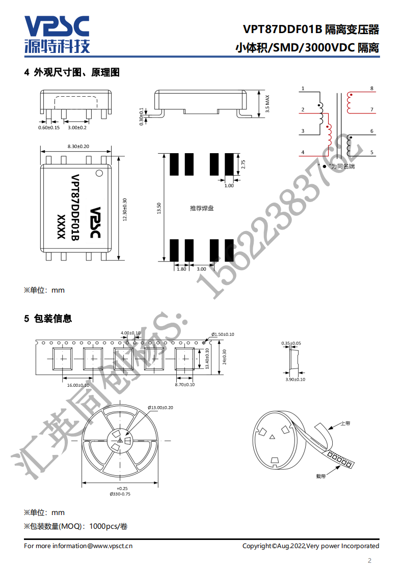 扫码加入VPT87DDF01B隔离变压器 小体积/SMD/3000VDC隔离